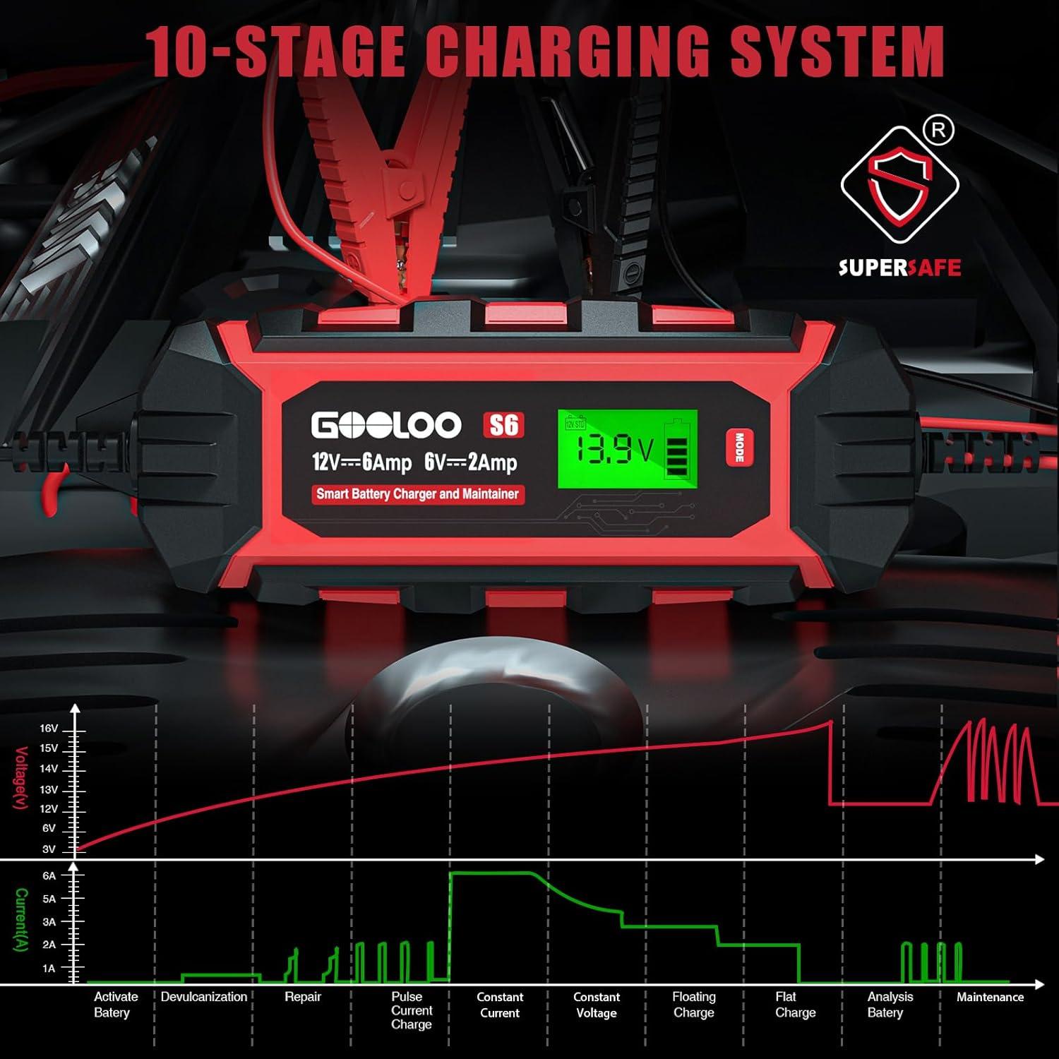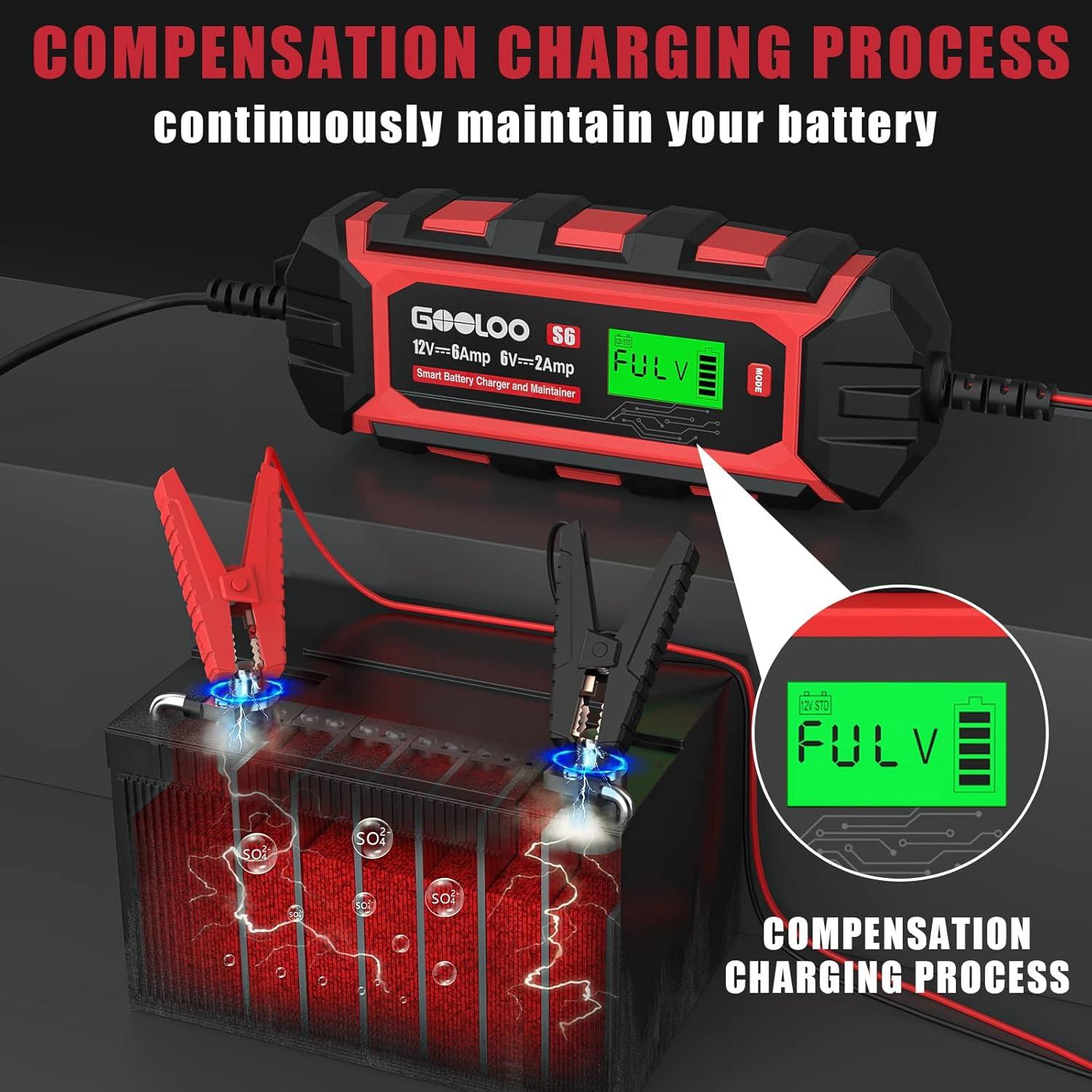 BATTERY CHARGER, MAINTAINER & DESULFATOR –IT IS NOT A CAR JUMP STARTER. GOOLOO S6 is an all-weather battery charger, battery maintainer, battery desulfator, works excellently with all 6volt and 12 volt lead-acid locomotive batteries like WET, SLA, GEL, AGM, FLOODED, VRLA batteries and 12volt LiFePO4 batteries.