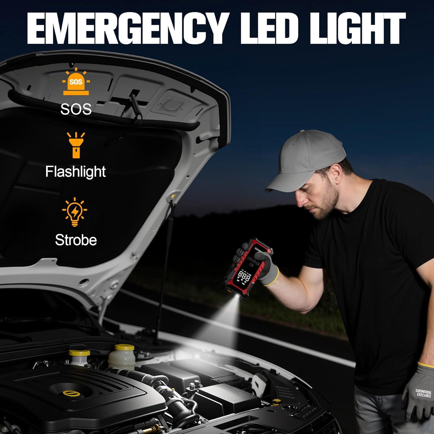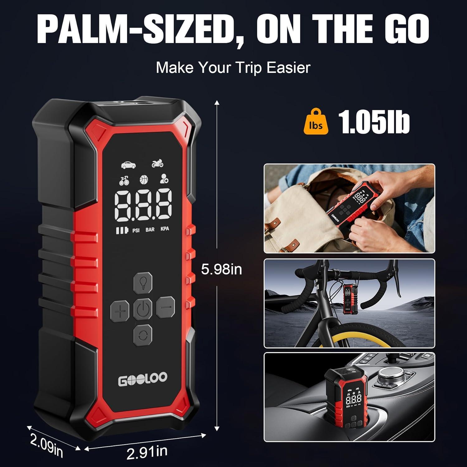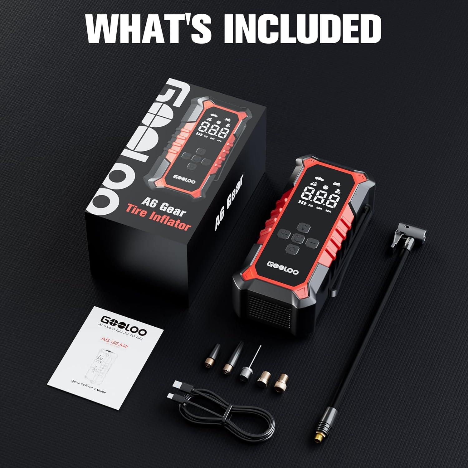 MULTI-FUNCTION EMERGENCY LIGHT & LED DISPLAY: GOOLOO A6 Gear works as both an inflator and an emergency tool. This battery powered tire inflator features an ultra-bright LED flashlight with multiple modes (steady, SOS, and strobe), providing nighttime illumination for safe operation. And its large-font LED display ensures clear pressure readings even in bright sunlight.