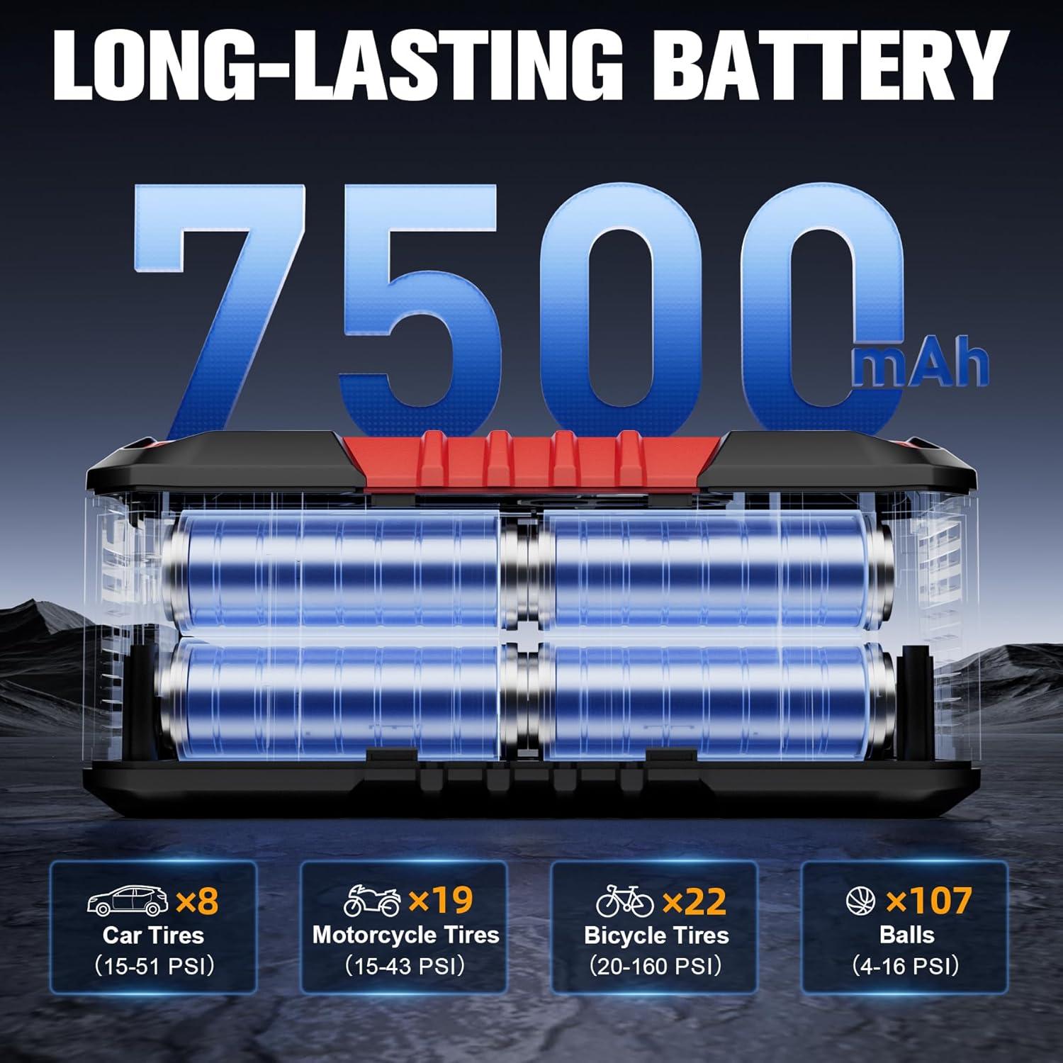 EXTENDED BATTERY LIFE & CONSISTENT POWER: Powered by 7500mAh high-performance lithium batteries, GOOLOO A6 Gear offers cordless operation for up to 45 minutes —sufficient for inflating 4 car tires, 22 bicycle tires, 19 motorcycle tires, or 107 balls. This reliable air compressor pump also features a Type-C fast charging port so it’s always ready when you need it.