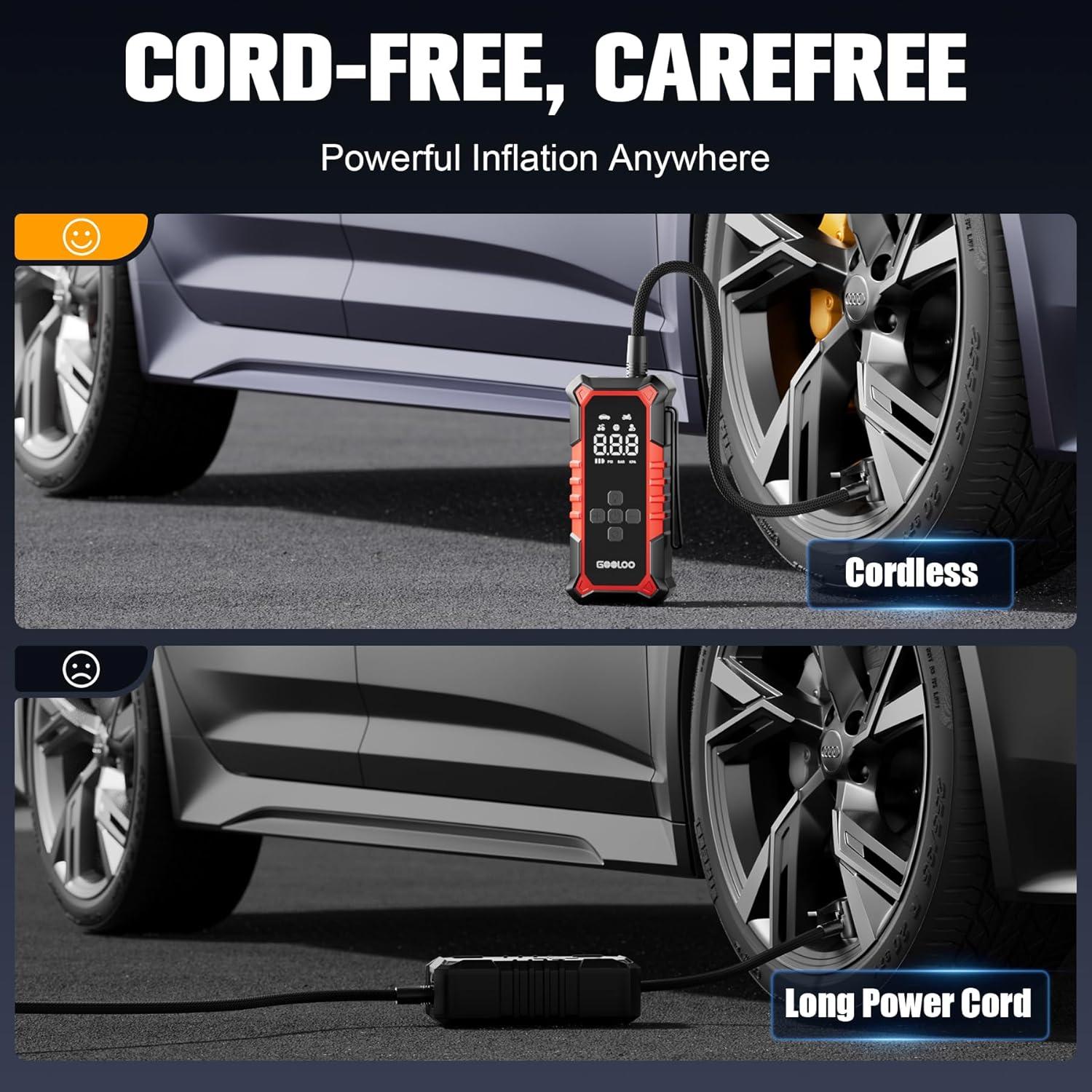 QUICK & EFFORTLESS INFLATION: GOOLOO A6 Gear cordless air pump for car tires is equipped with a 21,000 RPM ultra-powerful motor, delivering up to 160 PSI. It can inflate a 205/55 R16 car tire from 30 to 36 PSI in less than 1 minute—perfect for daily maintenance or emergencies, helping you stay safe on the road.