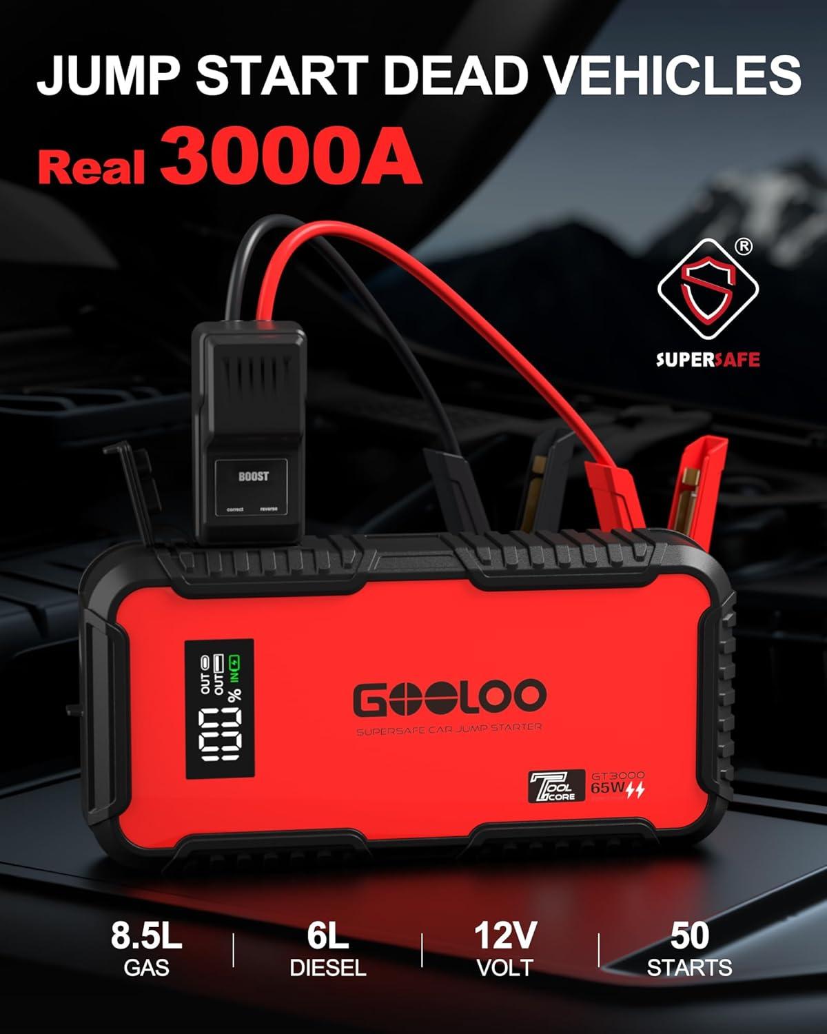 Real 3000A Jump Starter: As a compact car battery jump starter, GOOLOO GT3000 can instantly revive 12V dead batteries in seconds. Compatible with up to 8.5L gas and 6.0L diesel engines, it starts cars, trucks, motorcycles, and SUVs with ease. Even at extremely low voltage, just press the “BOOST” button to get back on the road. Designed to perform from -4°F to 131°F, this reliable jump pack ensures instant power anytime, anywhere.