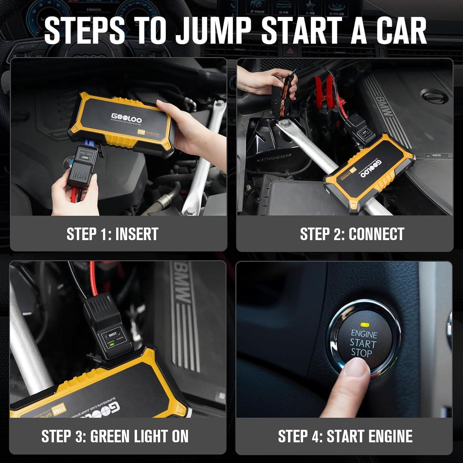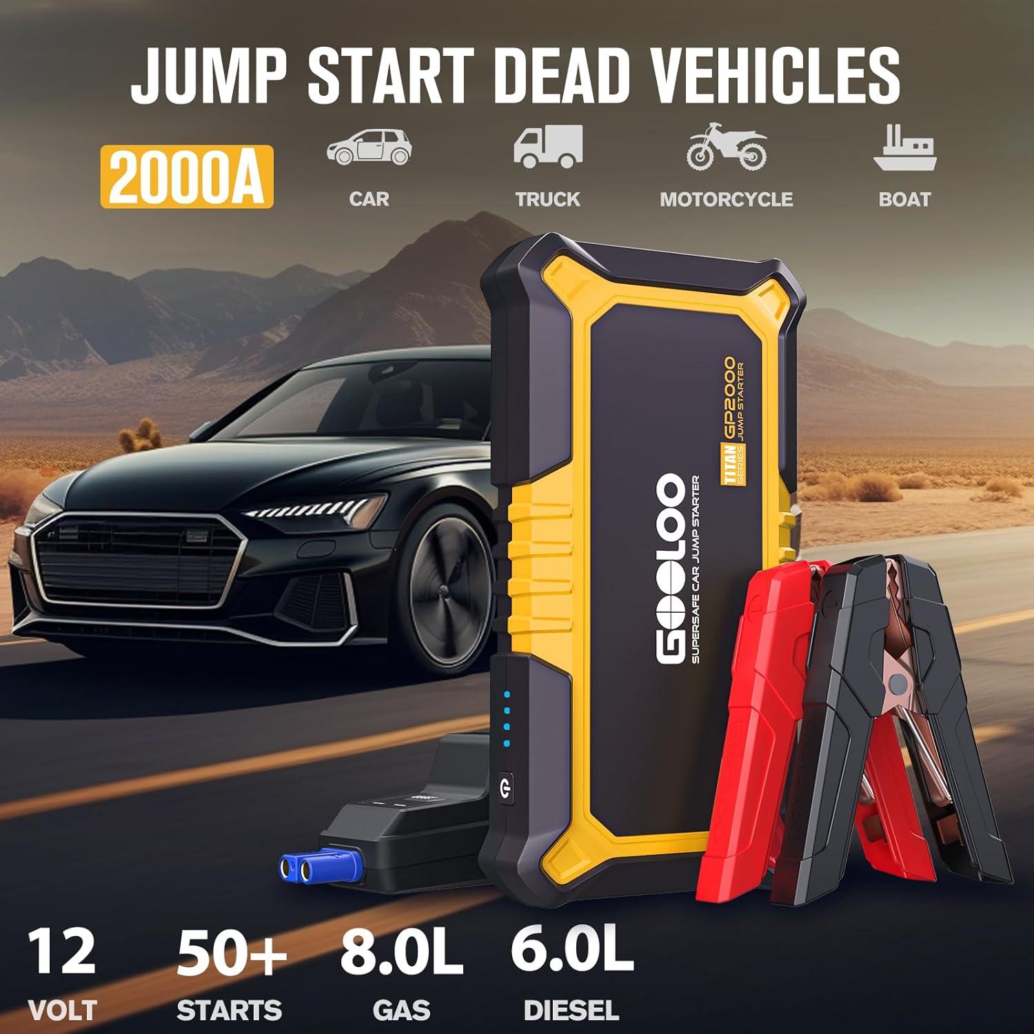 Emergency Life Saver:The GOOLOO car battery charger jump starters with 2000A peak cranking power will jump start all 12-volt dead vehicles up to 8.0L gas or 6.0L diesel. The GP2000 car jump starter battery pack is suitable for cars, motorcycles, SUVs, trucks cargo vans, ATVs, snowmobiles, yachts, and many more.