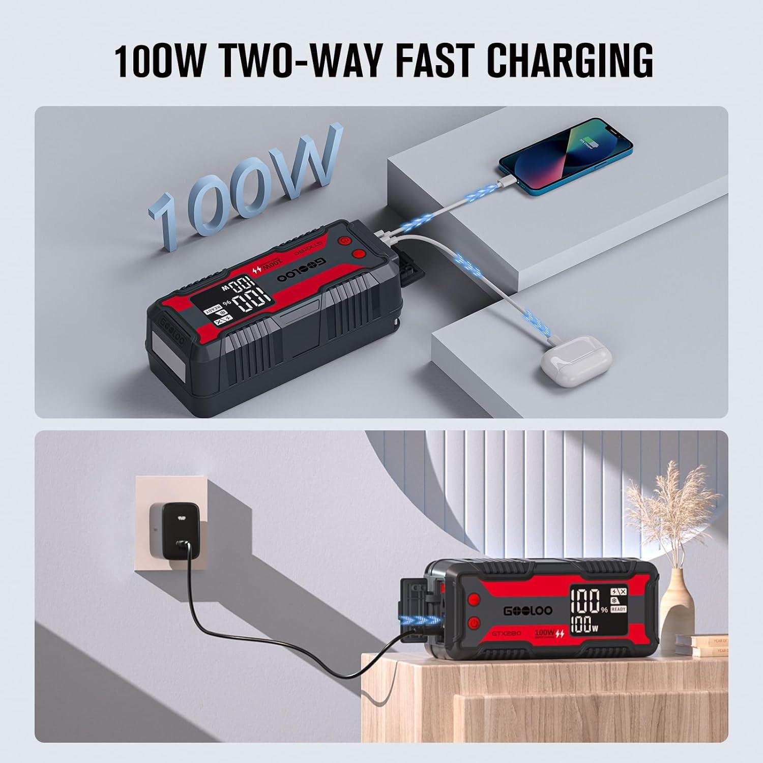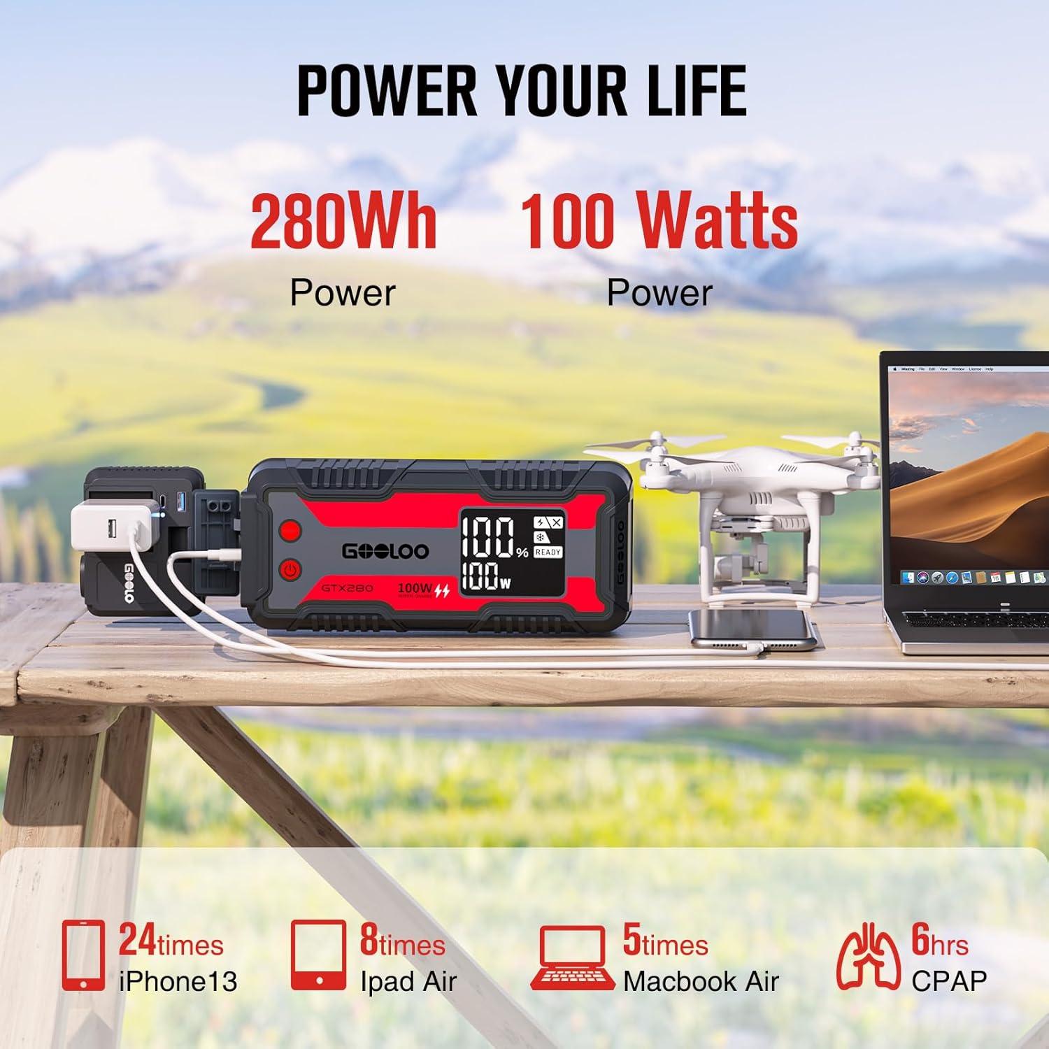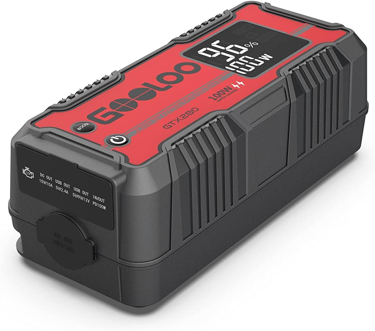 [What You Get] – GOOLOO Heavy-Duty Portable Jump Starter Power Station GTX280 (Jumper Cable IS NOT included), Car Inverter, PD100W Data Cable, USB to Type-C Cable, Hook, Carrying Strap, Carrying Bag, User Manual, 18 Months Warranty and Lifetime Tech Support.